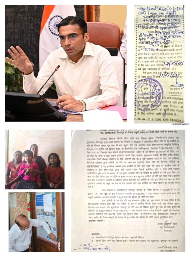 विधवा महिला फरियादी प्रिया पति विकास कुमार की मृत्यु उपरांत एक वर्ष से न्याय को भटक रही थी। दंपति द्वारा सी.एस.एल. फाईनेंस लि0 से 6.50 लाख का ऋण लिया था तथा ऋण का बीमा भी कराया था। उनके पति की मृत्यु 12 जुलाई 2024 को आकस्मिक मृत्यु हो गई थी। तभी से बैंक ने प्रिया को परेशान कर रहे थे, बार-बार बैंक के चक्कर कटा रहे थे तथा उनके घर के कागज भी जब्त कर लिए थे। सब जगह से परेशान होकर प्रिया डीएम से गुहार लगाई थी, जिस पर डीएम ने संबंधित बैंक के प्रबंधक की 6.50 लाख की आरसी काट दी। एक सप्ताह का समय दिए जाने के उपरांत भी बैंक द्वारा वसूली में सहयोग न करने तथा न ही महिला को नो ड्यूज नही दे रहे थे। जिस पर जिला प्रशासन द्वारा सीसीएल लिमिटेड की राजपुर रोड शाखा को सील करते हुए ताला लगा दिया है। जिला प्रशासन निरंतर अपने कड़े फैसलों से जहां जनमानस को उनका अधिकार दिला रहा है वहीं जनमानस को अनावश्यक परेशान करने वालों पर भी नकेल कस रहा है, जिससे ऐसा कृत्य करने वालों में प्रशासन का खौफ भी बढा है। बावजूद इसके नये प्रकरण भी सामने आ रहे हैं। जिलाधिकारी सविन के सम्मुख एक ताजा प्रकरण बैंक से आया है जिसमें महिला के पति की मृत्यु हो जाने पर बीमित बैंक ऋण के एवज में सुरक्षा देने के बजाय विधवा महिला को परेशान किया जा रहा था। जिस पर प्रशासन ने बैंक को सील कर दिया है। जिला प्रशासन के नित नए कड़े व बड़े फैसलों की ऋृंखला जारी है। जिला प्रशासन अपने नए अवतार में है। अब असहाय निर्बल के शोषण की घटनाओं पर प्रशासन अपने प्रचंड रूप में नजर आ रहा है। जनमानस को गुमराह-परेशान करने वालों पर सख्त फैसलों से जहां नकेल कसी जा रही हैं, वहीं जनमानस में भी खुशी की लहर है। 04 बालिकाओं की विधवा मॉ प्रिया ने डीएम से लगाई गुहार, जिस पर प्रशासन ने आरसी काटते हुए कार्यवाही शुरू कर दी है।