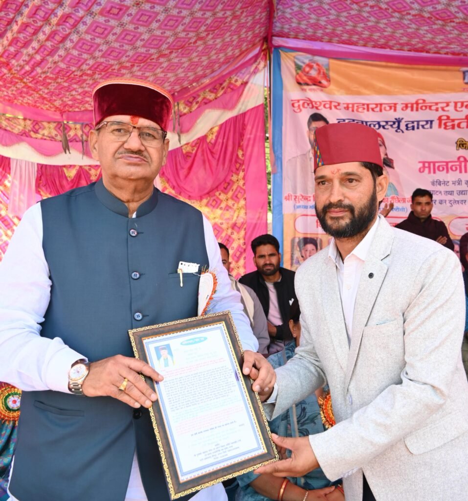 टिहरी/ऐंदी, 02 जून। प्रदेश के कृषि एवं कृषक कल्याण मंत्री गणेश जोशी ने अपने तीन दिवसीय उत्तरकाशी व टिहरी भ्रमण के तीसरे दिन टिहरी जनपद के ऐंदी क्षेत्र स्थित पत्थरखौल गांव पहुंचकर दुलेश्वर महाराज मंदिर में दर्शन पूजन किया। इस अवसर पर वे मंदिर प्रांगण में पर्यटन विकास समिति द्वारा आयोजित पारंपरिक मेले में शामिल हुए और स्थानीय जनता से संवाद भी किया।